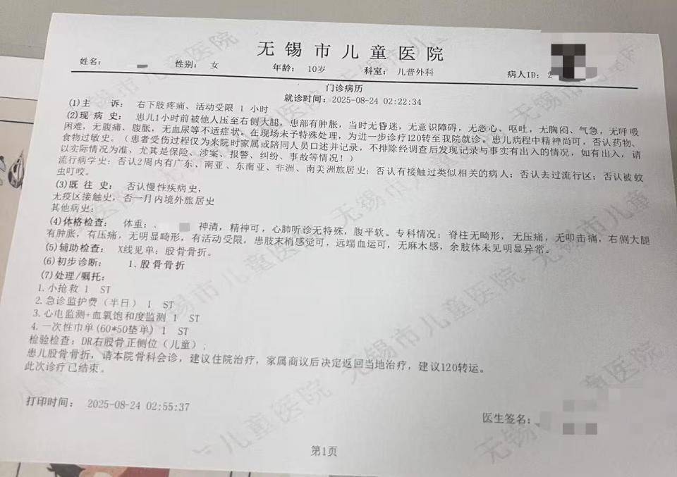 朱女士向记者出示的医院病历显示,8月24日凌晨,朱女士的女儿到医院就诊。医院诊断朱女士的女儿右股骨骨折,需要住院进一步治疗。
